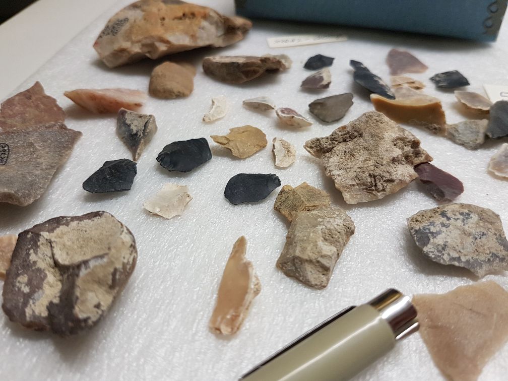 I have been moving through drawers in numerical order, and I’m currently working on a set of drawers that contain lithic material from an Archaic site component. What is interesting about these drawers is that they contain a large amount of lithic debitage (debris generated during the making of stone tools), which we did not see in the other collections we cataloged. There were some lots of “stone samples” in the Larson collection, but for the most part the previously cataloged collections contained fully or partially finished tools, not the debitage generated in the making of the tools. Soil was screened during the excavation of these areas of 39BF2, which means that there are some rather small flakes in these lot numbers. This calls for some very small handwriting, and is making the numbering process take a bit more time than it does for drawers with larger objects. On the plus side, the smooth writing surface on most of these flakes makes the numbering pens last much longer than they do when there’s large lots of potsherds to be numbered!